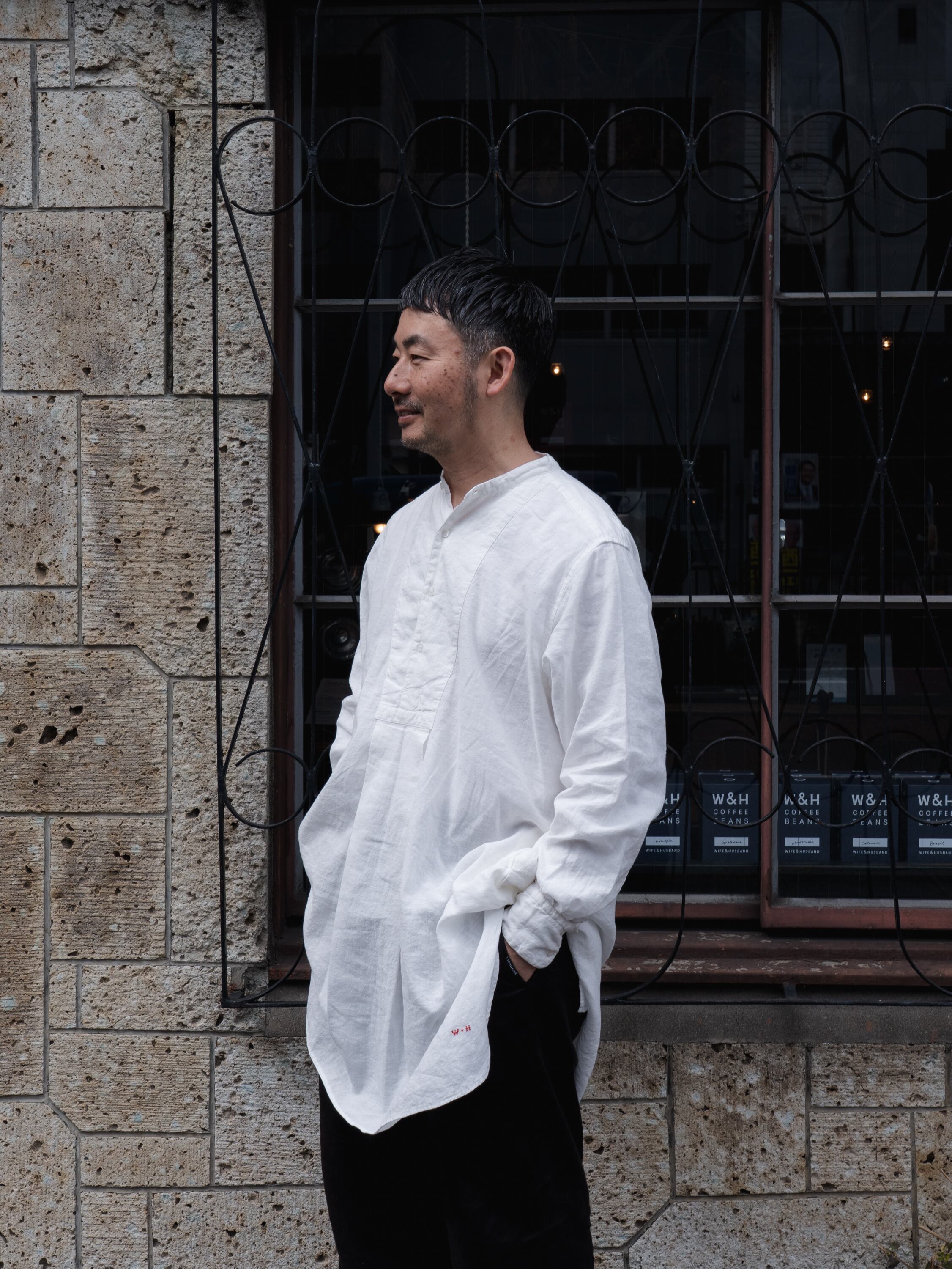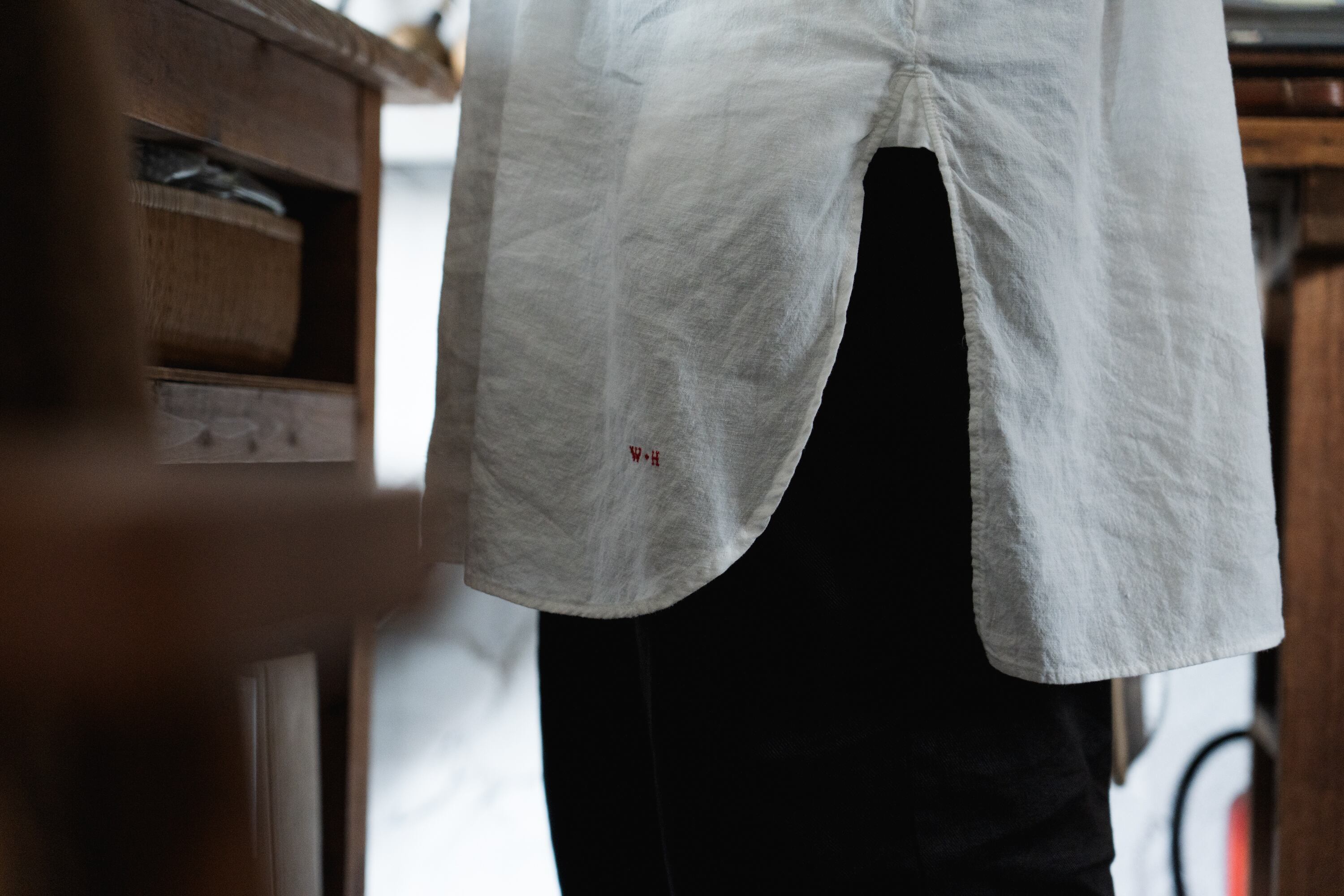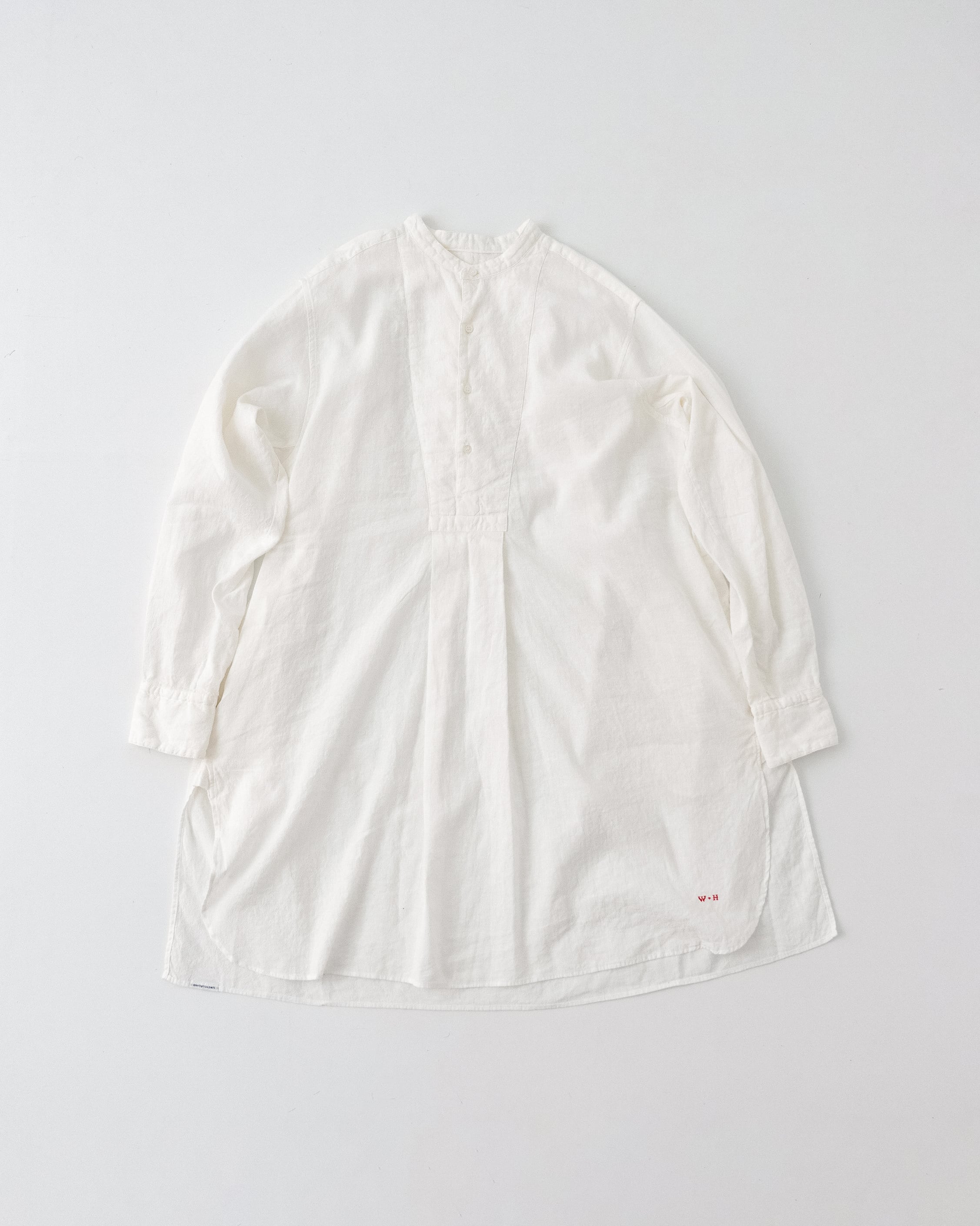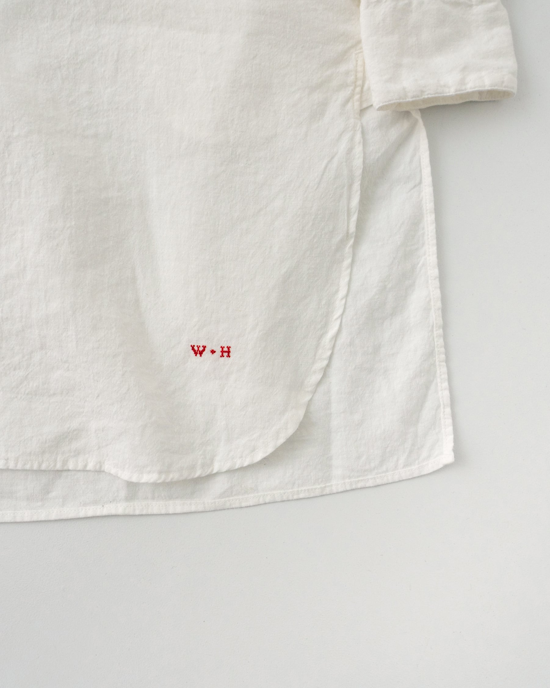 20世紀初頭頃のスモックシャツをベースに、現代の暮らしにより馴染むスタイルへとデザインしました。フランスなどのヨーロッパ諸国において羊飼いや農夫などの労働者が着用したのが起源のスモックは、当時は手仕事によって作られていました。作業に適した伸縮性を保持するため、背中に細かいタックが施されています。脇下のガゼット、両脇のマチもフランスの当時らしい貴重なディテールです。作業用の上着として着用していたスモックを作業場の壁の釘に引っ掛けるために、後ろ身頃の襟下にループがついています。フロント裾にはW&Hのイニシャルを、当時のクロスステッチの手法を再現して刺繍しました。