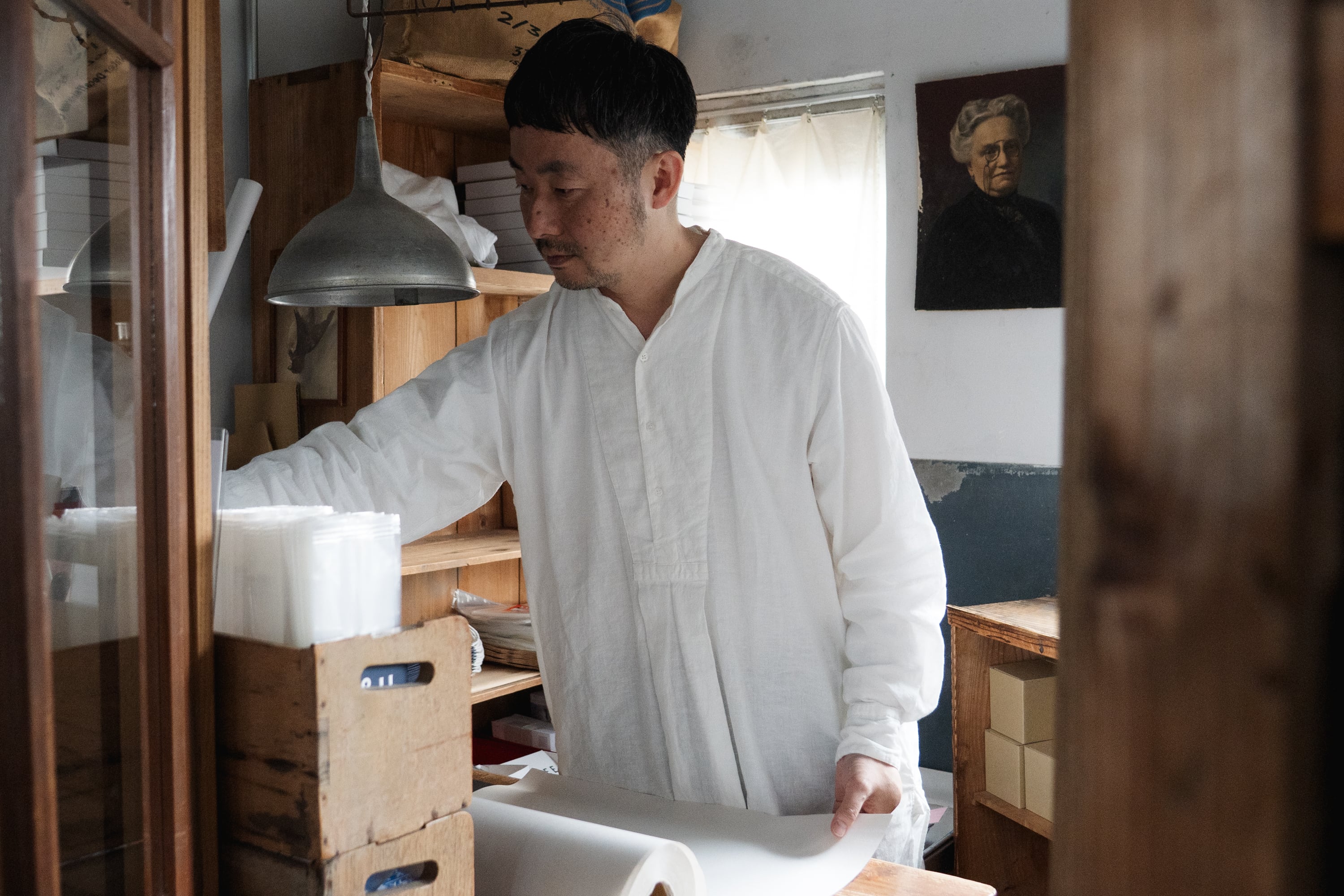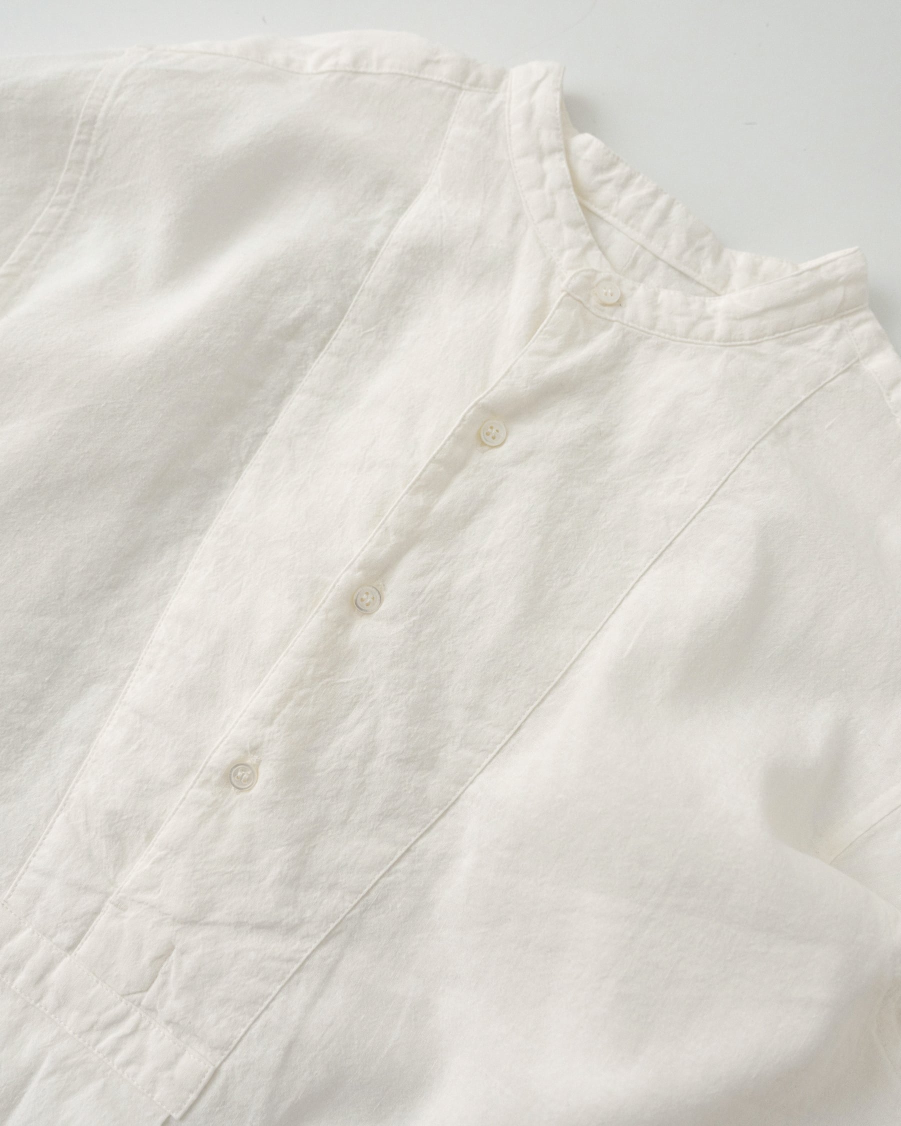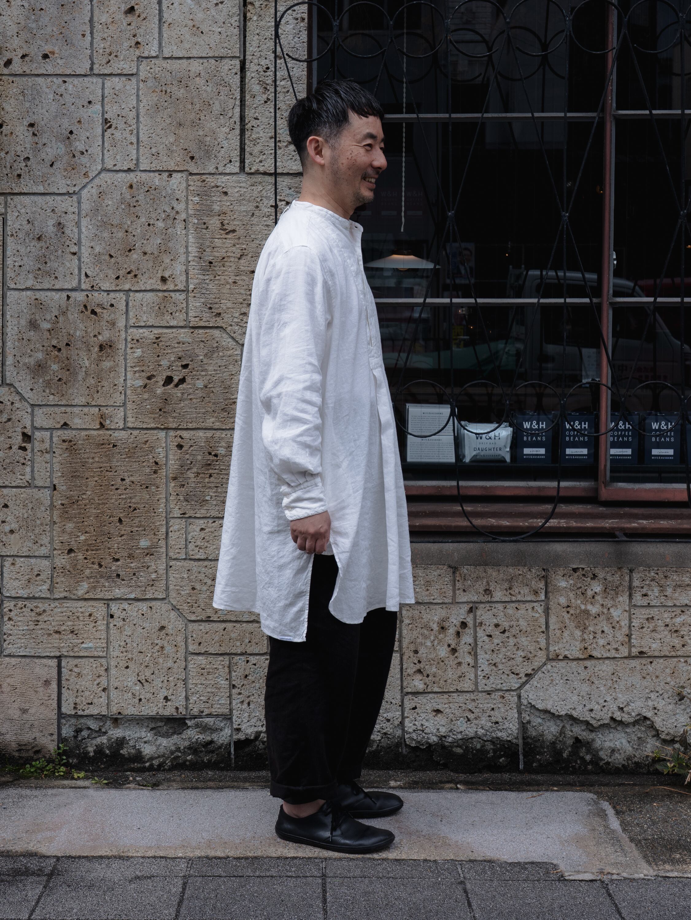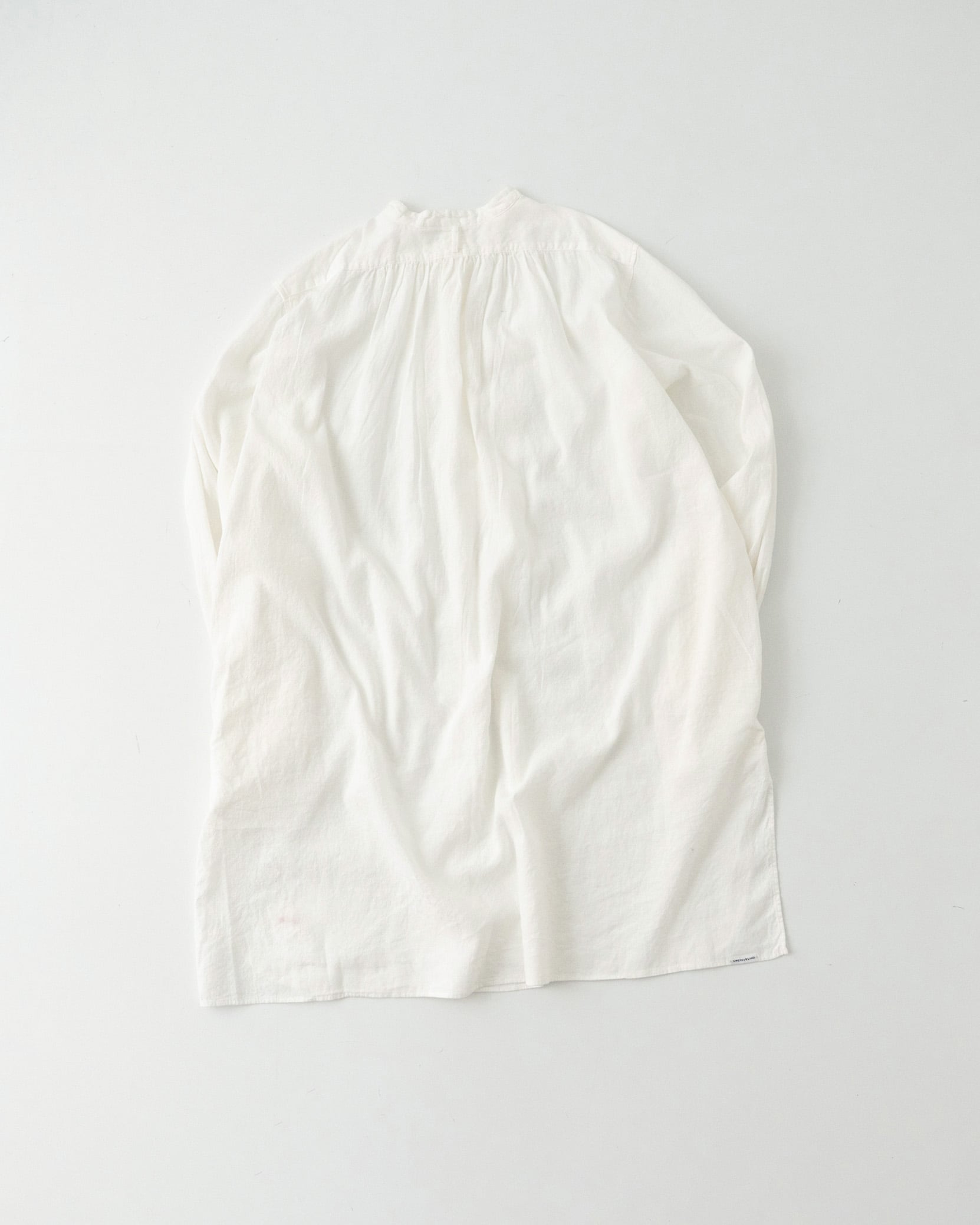 20世紀初頭頃のスモックシャツをベースに、現代の暮らしにより馴染むスタイルへとデザインしました。フランスなどのヨーロッパ諸国において羊飼いや農夫などの労働者が着用したのが起源のスモックは、当時は手仕事によって作られていました。作業に適した伸縮性を保持するため、背中に細かいタックが施されています。脇下のガゼット、両脇のマチもフランスの当時らしい貴重なディテールです。作業用の上着として着用していたスモックを作業場の壁の釘に引っ掛けるために、後ろ身頃の襟下にループがついています。フロント裾にはW&Hのイニシャルを、当時のクロスステッチの手法を再現して刺繍しました。