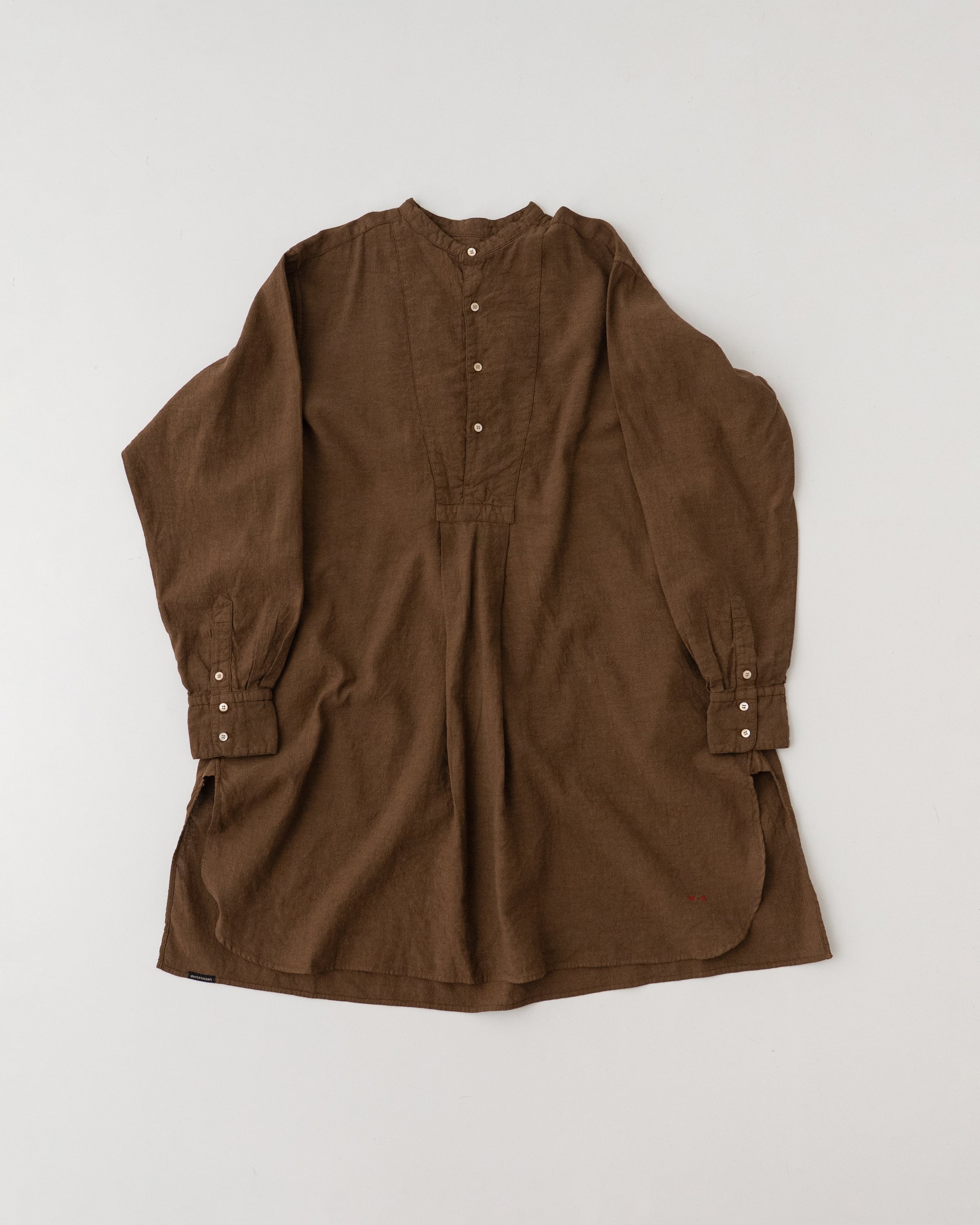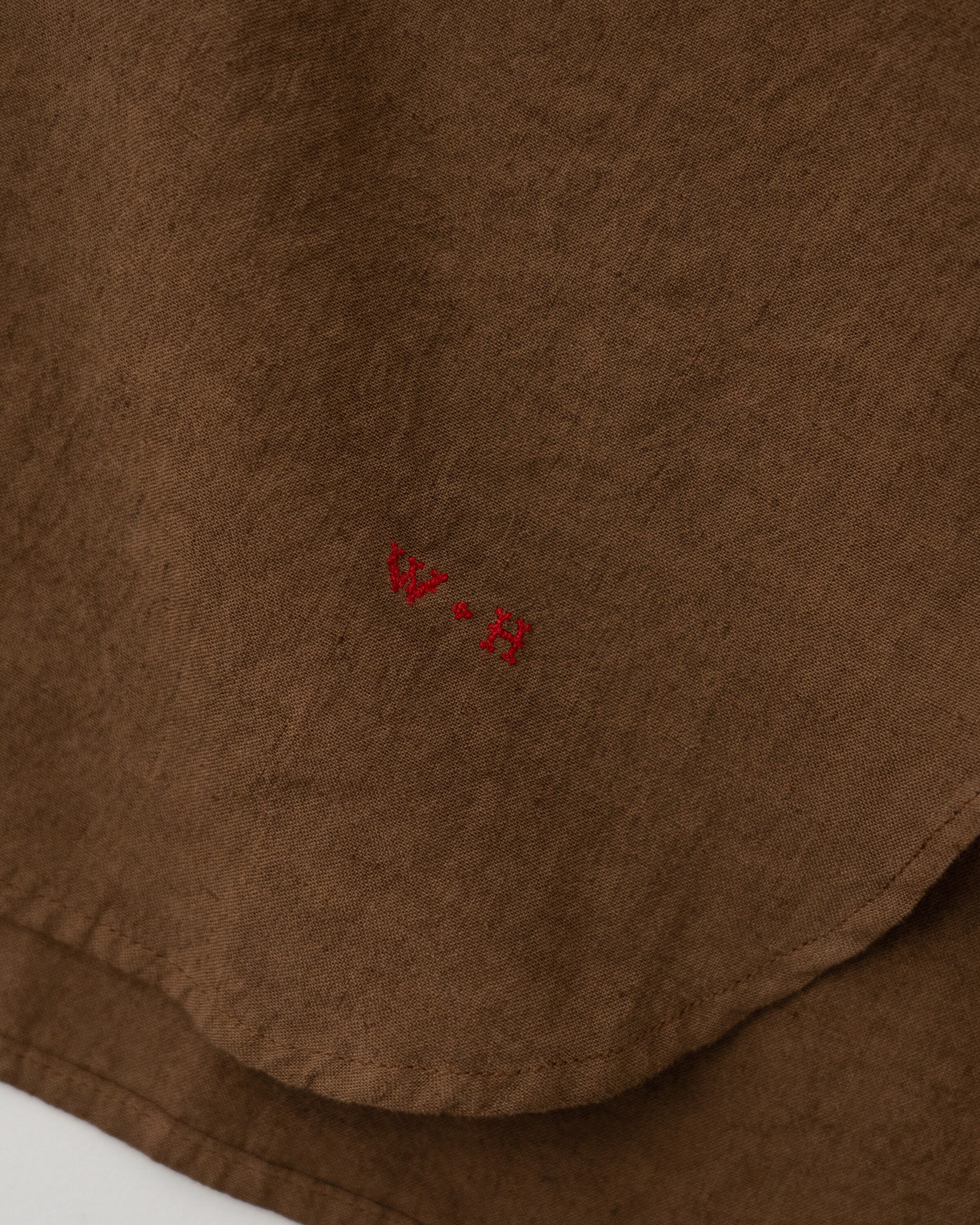 20世紀初頭頃のスモックシャツをベースに、現代の暮らしにより馴染むスタイルへとデザインしました。フランスなどのヨーロッパ諸国において羊飼いや農夫などの労働者が着用したのが起源のスモックは、当時は手仕事によって作られていました。作業に適した伸縮性を保持するため、背中に細かいタックが施されています。脇下のガゼット、両脇のマチもフランスの当時らしい貴重なディテールです。作業用の上着として着用していたスモックを作業場の壁の釘に引っ掛けるために、後ろ身頃の襟下にループがついています。フロント裾にはW&Hのイニシャルを、当時のクロスステッチの手法を再現して刺繍しました。