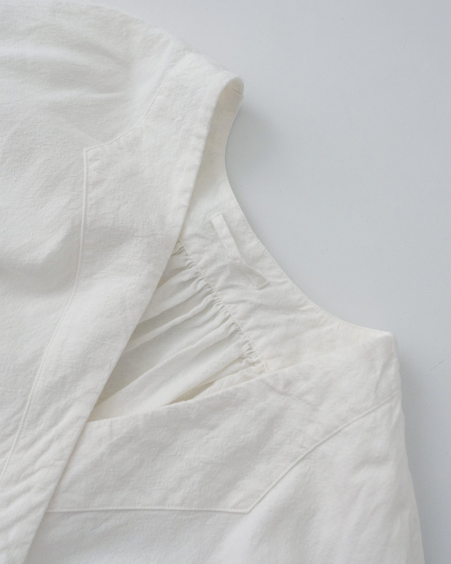 20世紀初頭頃のフランスで、女性がコルセットから解放される中で登場したカシュクールワンピースがデザインソースです。上半身を巻き付けるデザインは、作業のしやすさや、妊娠・授乳中などの身体の変化に対応できる実用的な服として生まれたとされています。この時代のワークウェアによく使われている、襟元のフェイクラペルのデザインステッチを施しました。当時、このデザインステッチは、女性労働者の作業着の摩擦が多い首襟周りの生地の補強の意味合いがありました。また、産業化が進む中で無機質だった労働着に女性の上品さや個性を表現するためにも用いられており、シンプルなカシュクールにデザインステッチを入れることでより女性らしさを感じられるデザインとなっています。
