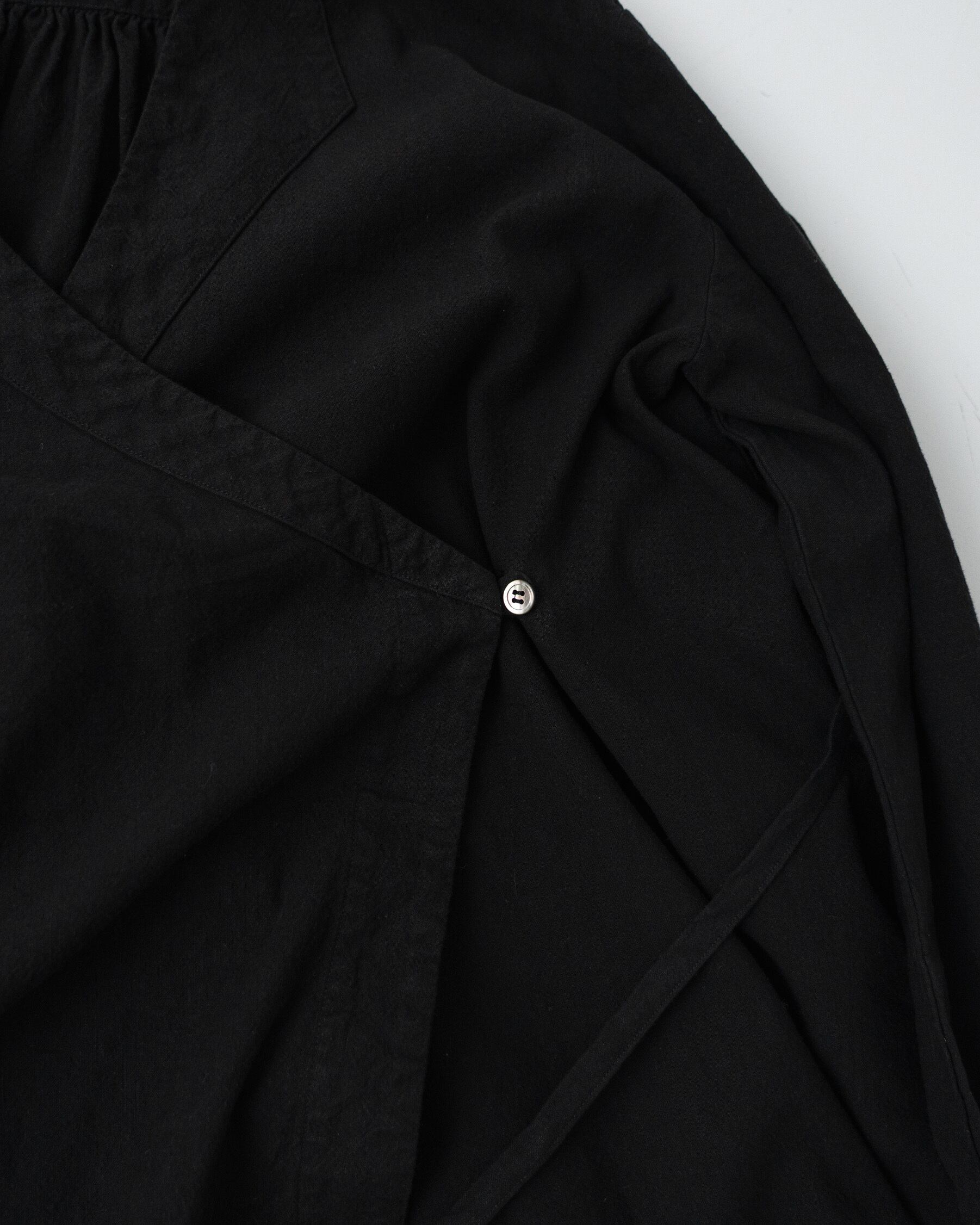 20世紀初頭頃のフランスで、女性がコルセットから解放される中で登場したカシュクールワンピースがデザインソースです。上半身を巻き付けるデザインは、作業のしやすさや、妊娠・授乳中などの身体の変化に対応できる実用的な服として生まれたとされています。この時代のワークウェアによく使われている、襟元のフェイクラペルのデザインステッチを施しました。当時、このデザインステッチは、女性労働者の作業着の摩擦が多い首襟周りの生地の補強の意味合いがありました。また、産業化が進む中で無機質だった労働着に女性の上品さや個性を表現するためにも用いられており、シンプルなカシュクールにデザインステッチを入れることでより女性らしさを感じられるデザインとなっています。