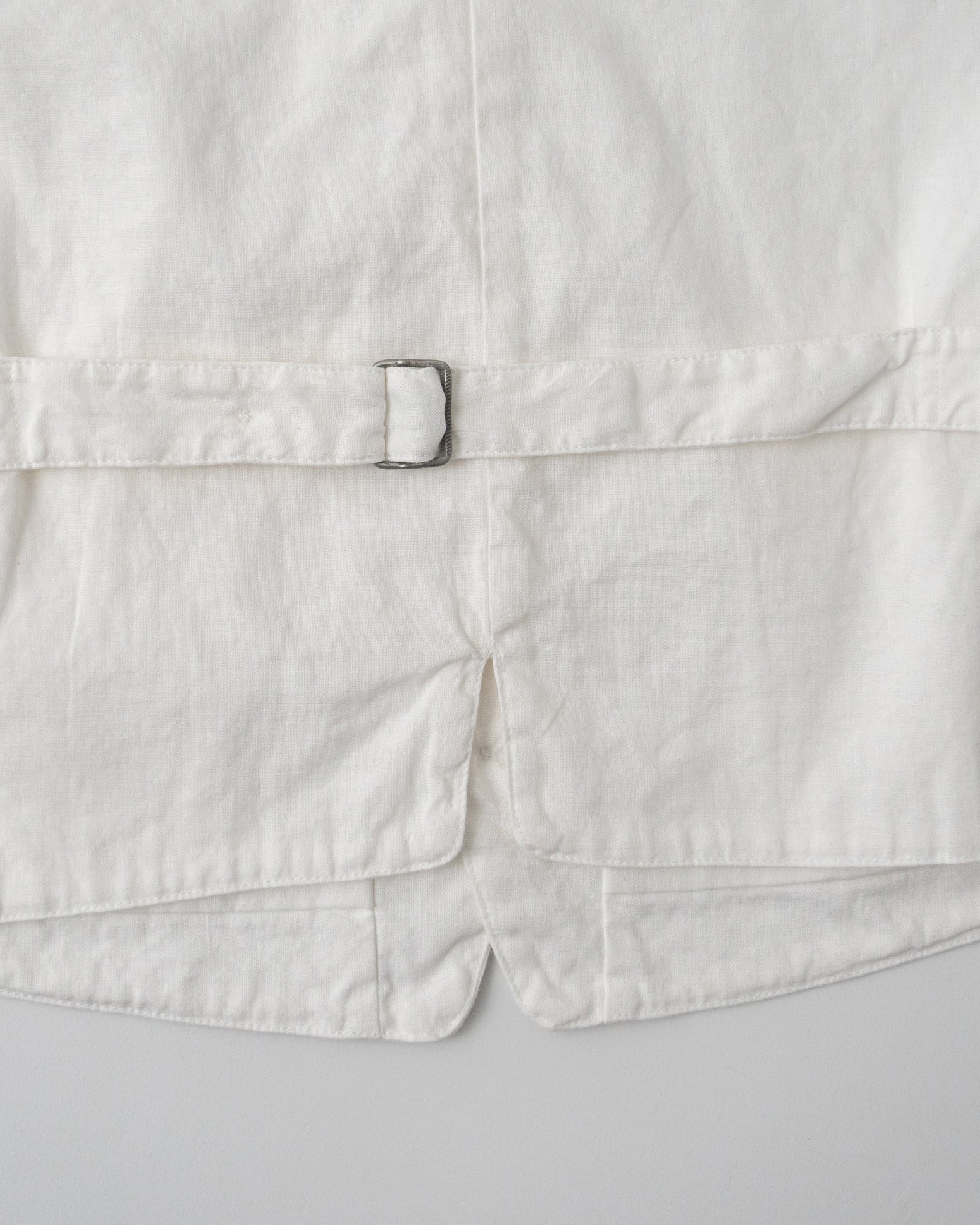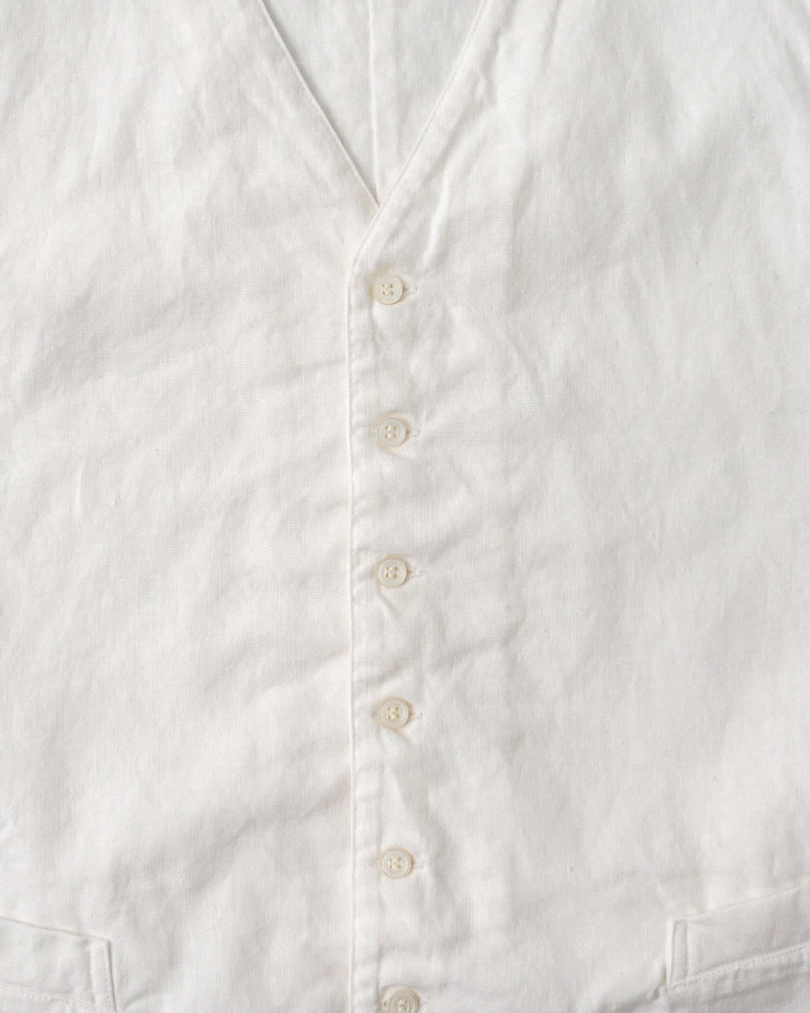 20世紀中頃のフランスのサービス用ベストをベースに、より着心地の良いスタイルへと落とし込みました。当時カフェやレストランで働く人々は、シャツとベストを重ねて着用し、ベストは日々の仕事において重要な役割を担っていました。フロントは作業の邪魔にならないシンプルなデザインで、小さな道具や身の回りのものを収めるためのポケットを配置しています。背中にはサイズを調整するための尾錠がついており、当時の実用的な仕様を踏襲しました。単なる装飾ではなく、機能性と着心地の良さを備えた実用的なベストとして仕上げています。